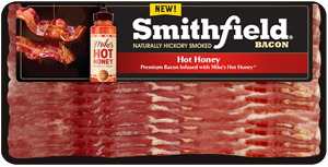 Product pack photo caption: Smithfield Mike’s Hot Honey Bacon – hickory smoked, sweet heat, crave worthy flavor in every bite.